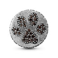A stylish sterling silver charm featuring the silhouette of a black dog footprint, embellished with striking black cubic zirconia. Adding a touch of glamour, a surrounding ring of sparkling cubic zirconia enhances the charm's elegance. This piece beautifully captures the essence of a beloved pet, making it a chic accessory for any dog lover.