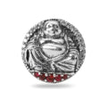 A sterling silver Buddha charm in a seated pose, serenely crafted, with a base adorned by a few vibrant red cubic zirconia. This tranquil and spiritually-inspired piece combines elegance with a touch of color, making it a meaningful addition to any jewelry collection for those who appreciate symbolic and serene accessories.